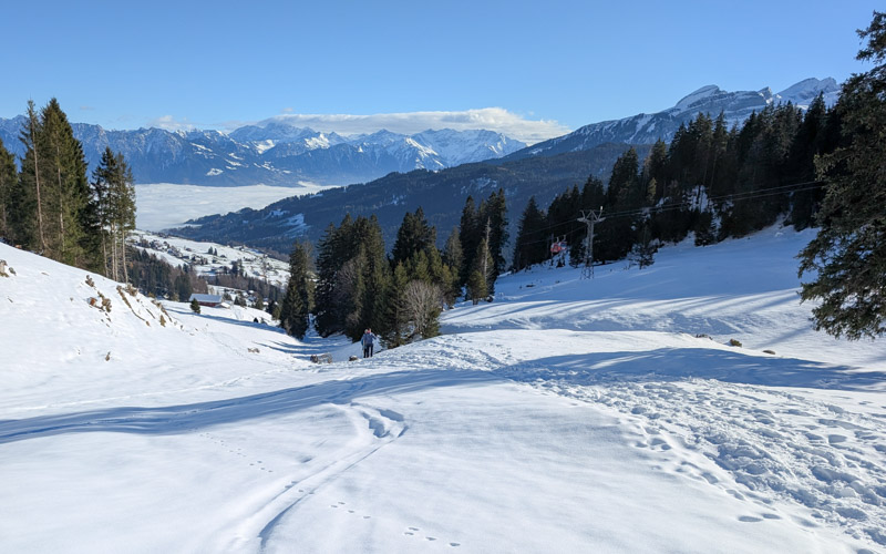 This winter trail hikes up to Gamplüt, a sunny hill overlooking the beautiful Toggenburg valley and Alpstein peaks.